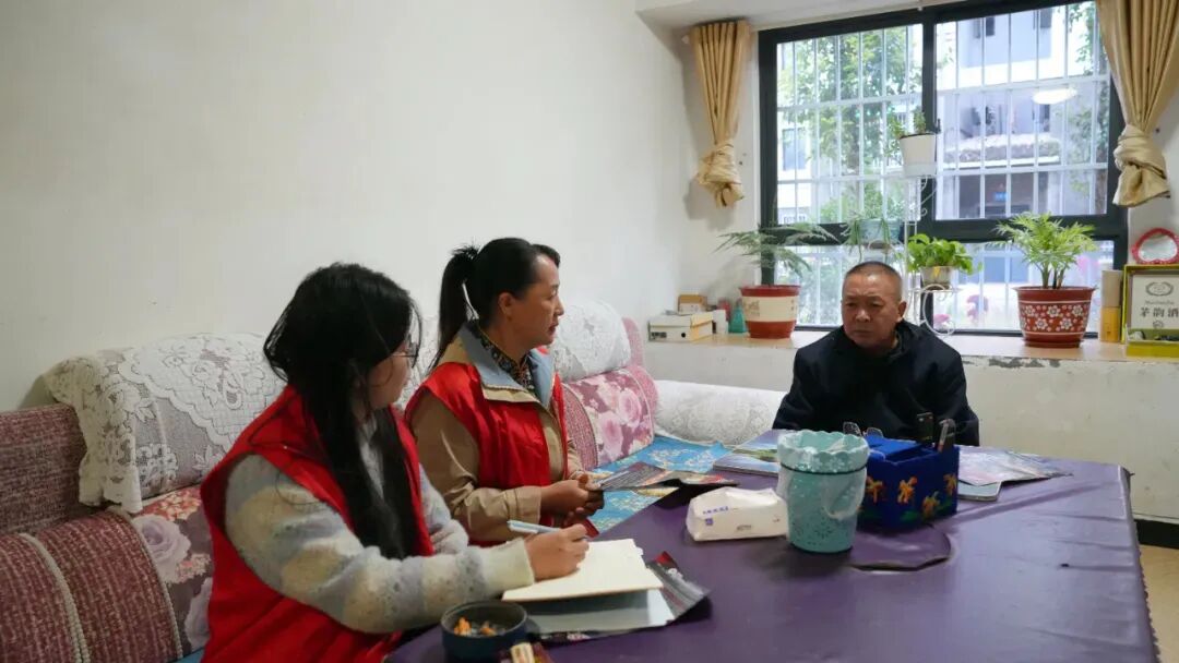 图为大坪街道社区工作人员在邱广家宣传交通、医保等惠民政策刘婷婷摄